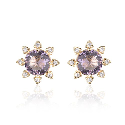 Brinco semijoia banhado a ouro 18k com pedra zirconia briolet em formato redondo na cor ametista, com microzirconias ao redor na cor cristal, medindo aproximadamente 1,4 x 1,4 cm.