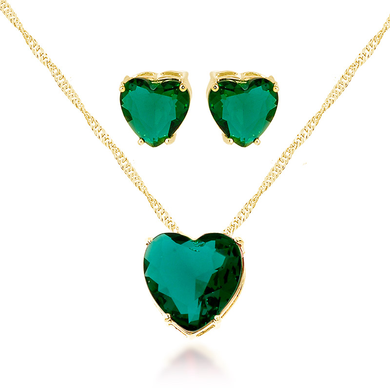 Conjunto folheado brincos de pedra de vidro lapidado em formato de coração nas cores: Azul Bic, Verde Esmeralda e Rosa. Corrente singapura com 45cm de comprimento e pingente igual aos brincos