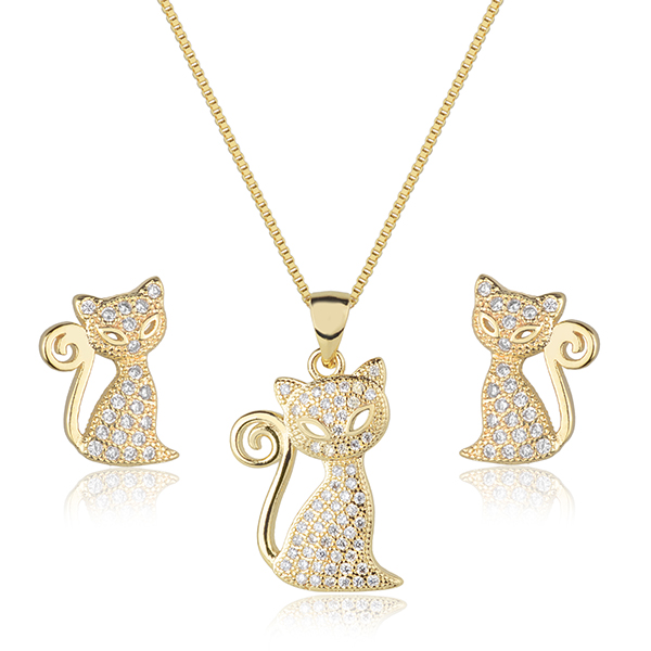 Conjunto semijoia gatinho - Linha Pets - banhado a ouro 18k e cravejado de microzirconias. Corrente veneziana 45cm + extensor. Pingente com aprox. 2,0x1,0cm e Brincos 1,2x0,7cm.