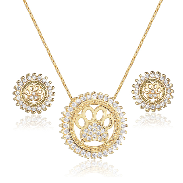 Conjunto semijoia mandala de patinha - Linha Pets - banhado a ouro 18k e cravejado de microzirconias. Corrente veneziana 45cm + extensor. Pingente 2cm e Brincos 1,2cm de diâmetro.